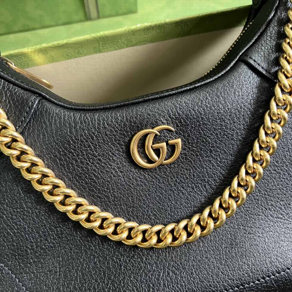 The Cruise 2023 Gucci Cosmogonie collection was presented against the backdrop of the historic Castel del Monte in Italy. The show brought together aesthetics from distant eras and geographies, and linked elements from the past with the present. This new small crescent-shaped shoulder bag was inspired by the House??s archives, it is crafted in soft leather and features the Double G emblem??a code originally introduced in the 1970s. Embodying the notion of the versatility, the bag is enriched with two shoulder straps, one is crafted in leather and the other is in Gucci??s recognizable gold-toned chain design.