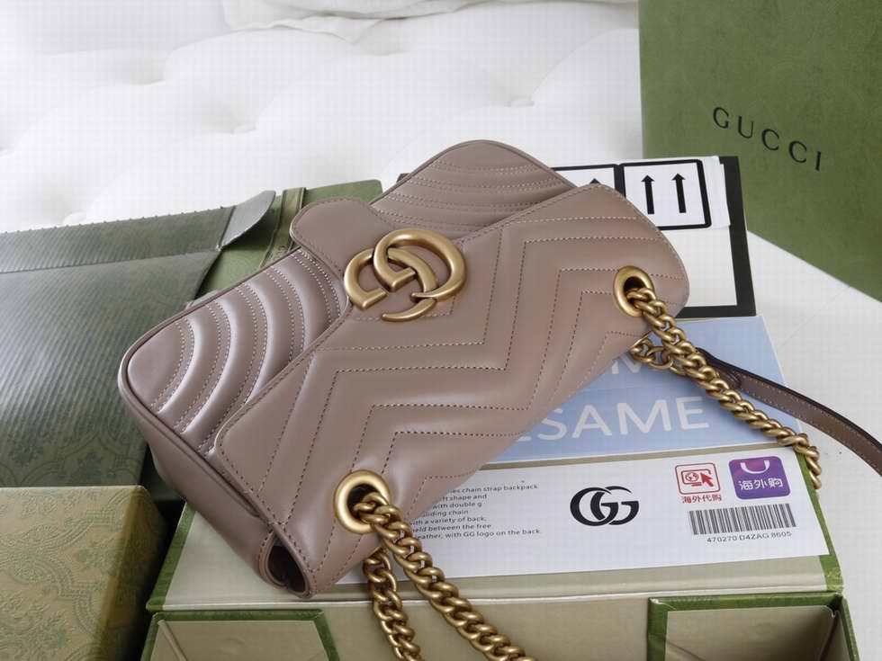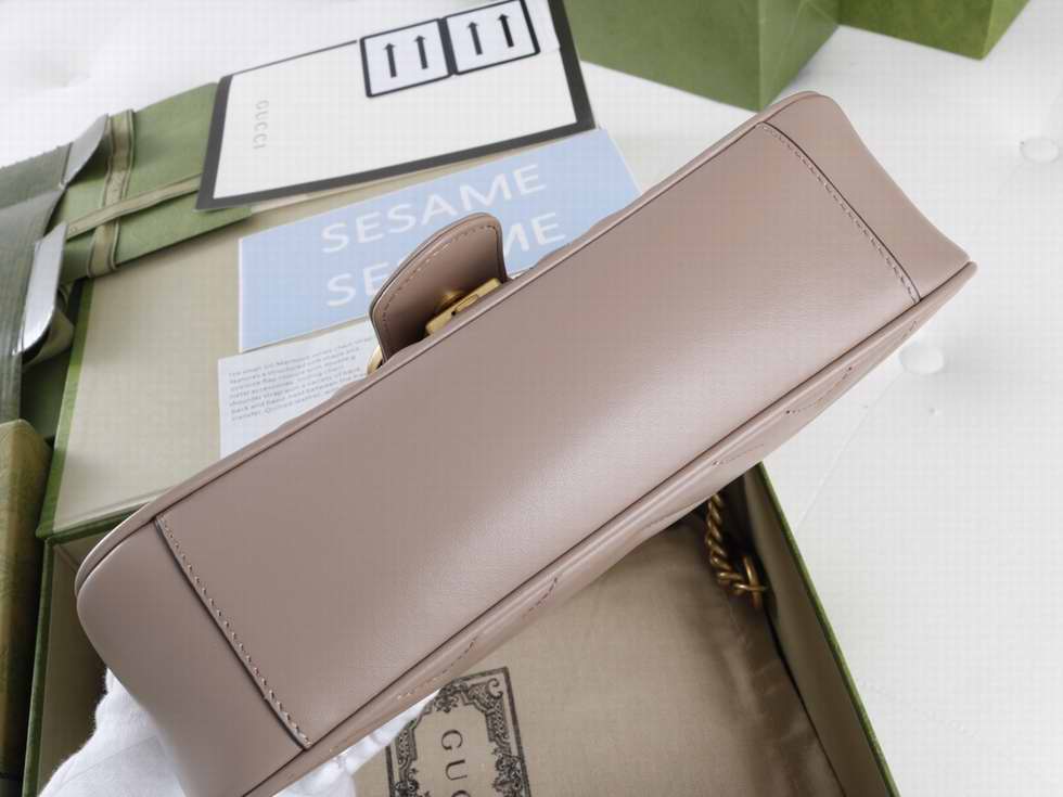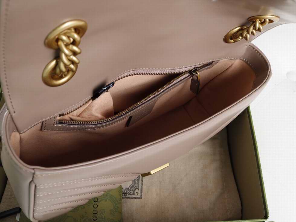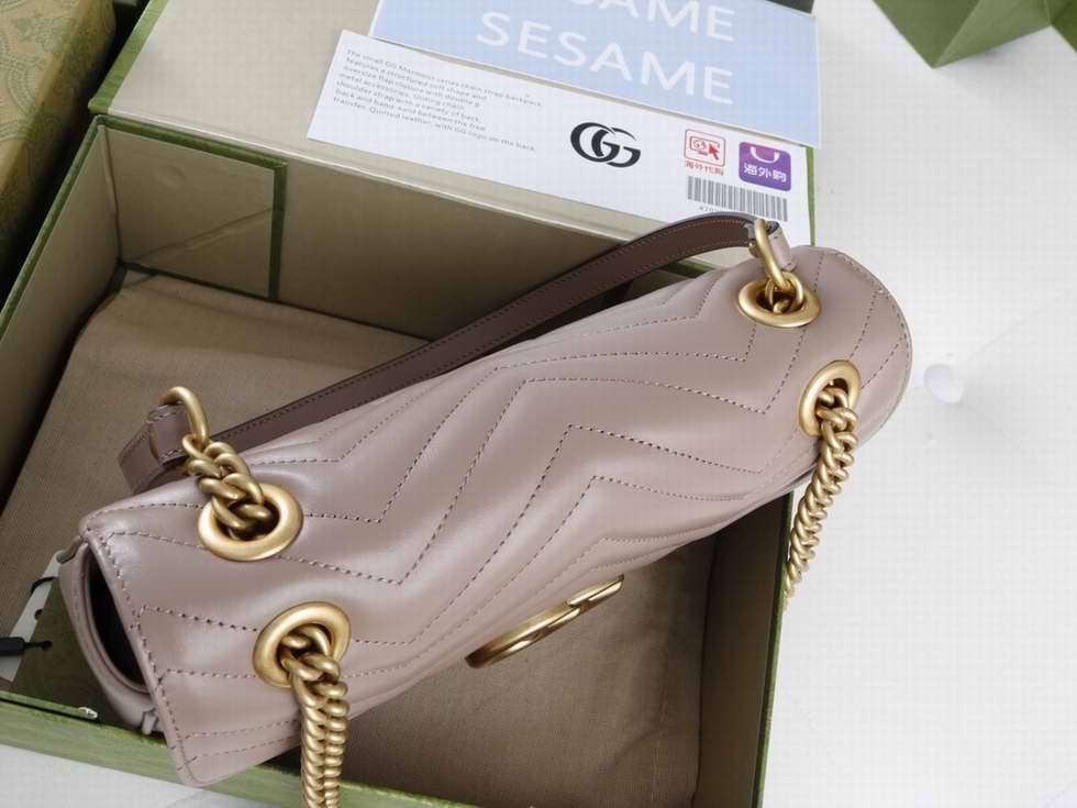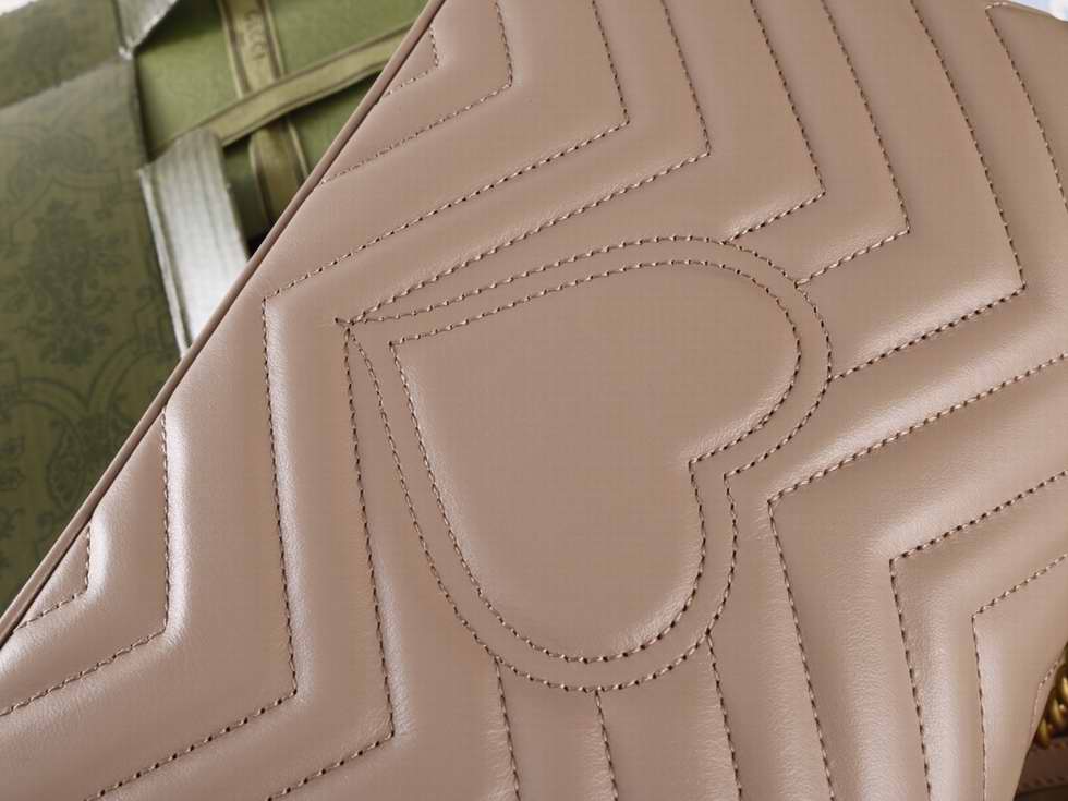 The small GG Marmont chain shoulder bag has a softly structured shape and an oversized flap closure with Double G hardware. The sliding chain strap can be worn multiple ways, changing between a shoulder and a top handle bag. Made in matelasse chevron leather with a heart on the back.